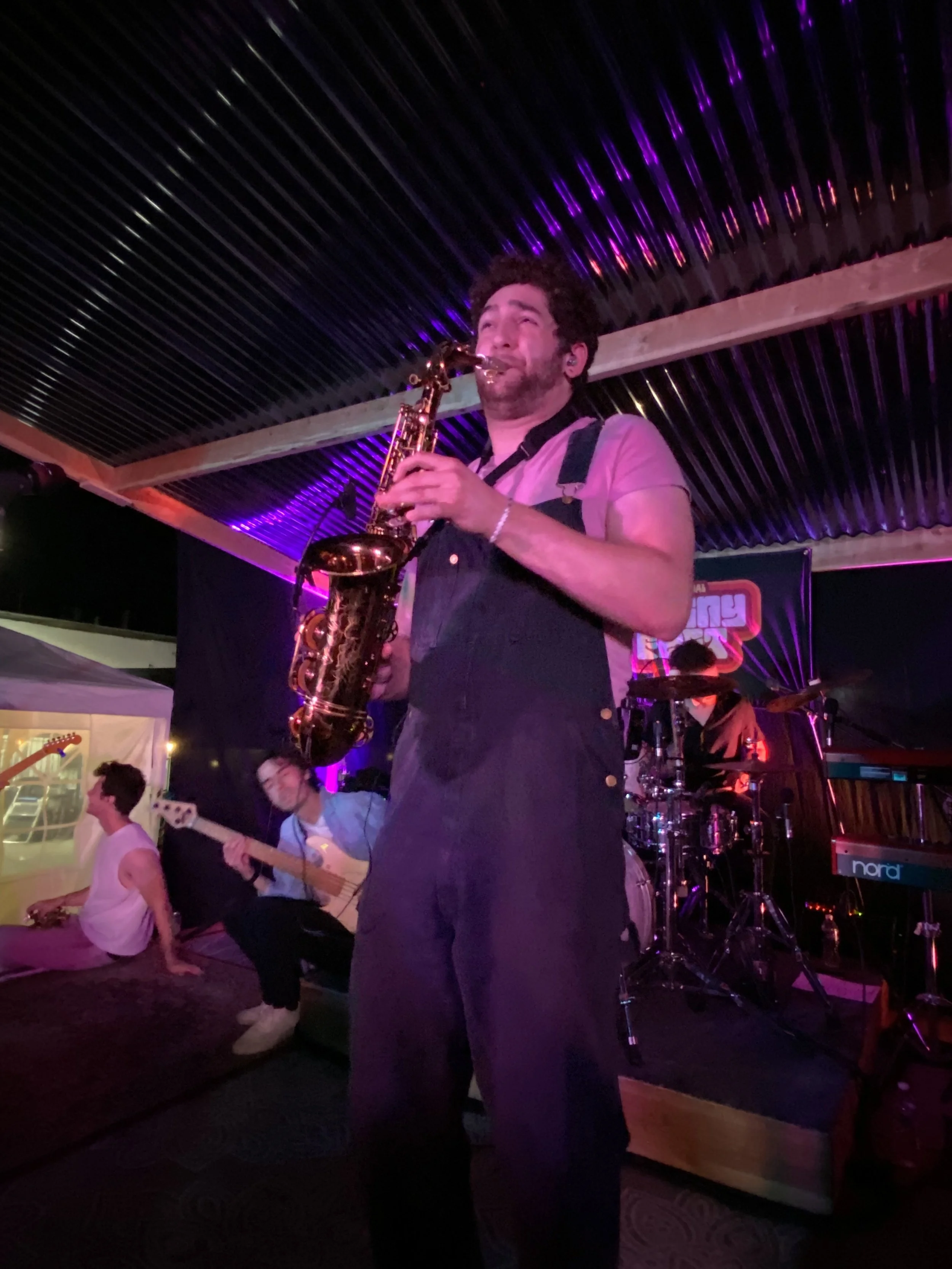 Two musicians performing on stage, one playing a bass guitar and the other playing drums, with a colorful sign in the background.
