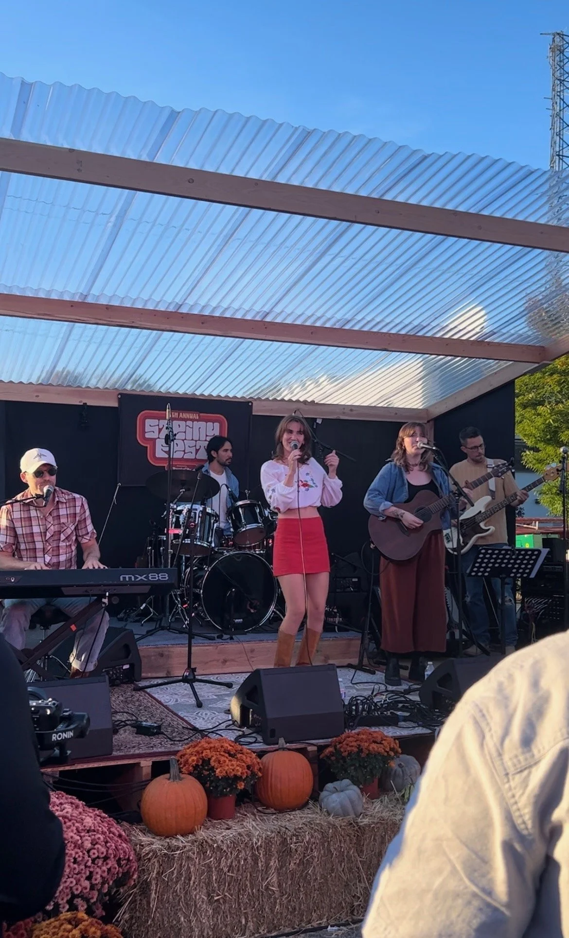 A four-piece band performing on outdoor stage at night, with a backdrop banner. The band includes a female guitarist and vocalist, two male guitarists, and a drummer. Stage is decorated with warm lighting and surrounded by autumn decorations.