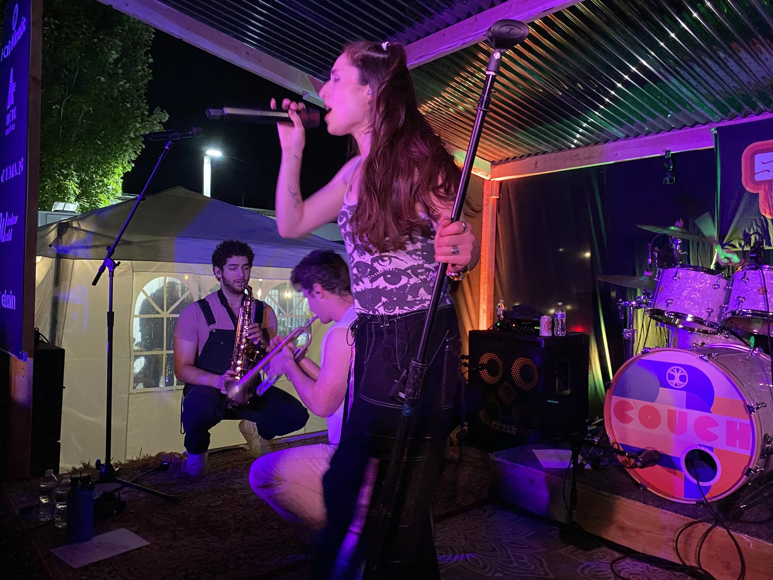 A woman singing into a microphone on stage, with a man playing drums in the background at a music performance event.