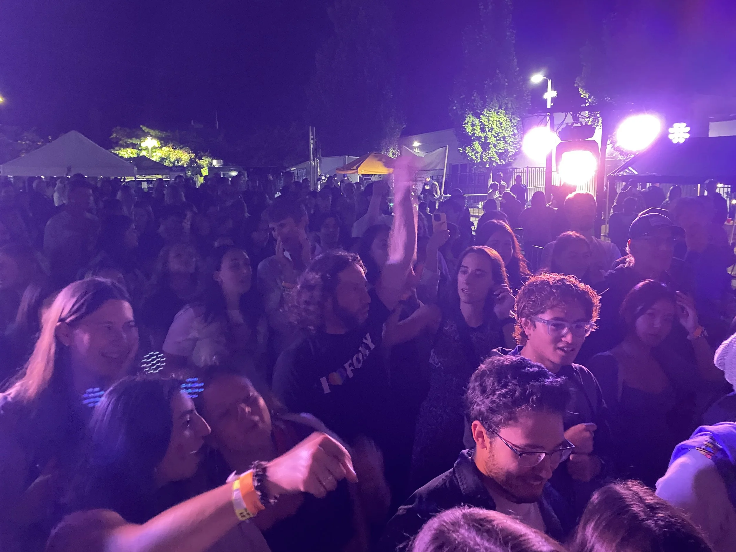 Group of young adults at an outdoor event, some holding drinks and smiling.