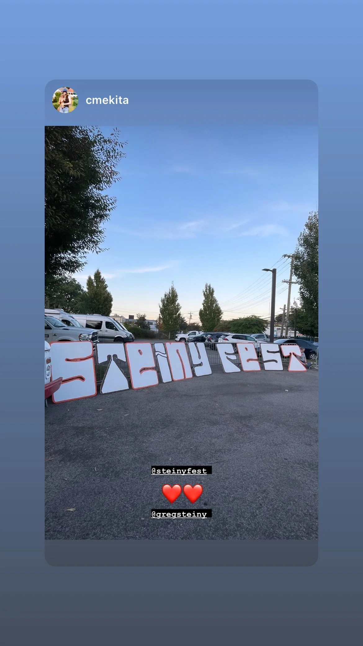 Wooden table with "STENY fest 2020" written on it and various handwritten messages and signatures around the text, with a person standing in front wearing jeans and sneakers.